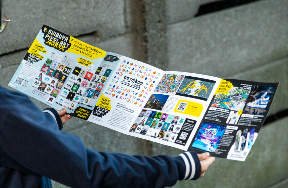 SHIBUYA PIXEL ART" is an annual pixel art festival held in Shibuya. More than 50 artists gather at five venues in Shibuya, and many events such as exhibitions, marshes, and contests are held. I was in charge of the art direction and design for this year's event, which marks the 5th anniversary of the event, called "REBOOT". The main visual was designed by mae, and the SPA's original font "Shibuya Pixel Font" was designed by BAN-8KU, two pixel artists. The work has been developed and produced in a variety of ways, including posters, publicity materials such as large screens and in-car advertisements, pamphlets, captions for art exhibitions, and visual effects for ceremonies. We are also continuing to design related projects and the NFT auction site.
