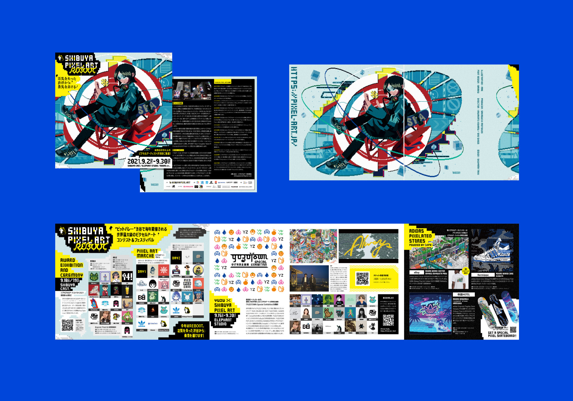 渋谷で毎年開催されるピクセルアートの祭典『SHIBUYA PIXEL ART』。渋谷の全5会場に50名以上のアーティストが集結し、作品展・マルシェ・コンテストなど多くのイベントが行われます。「REBOOT」と銘打ち開催された5周年となる今年のアートディレクション・デザインを担当しました。メインビジュアルはmaeさん、SPAのオリジナルフォント「Shibuya Pixel Font」はBAN-8KUさん、ピクセルアーティストの2人にご担当いただいています。ポスターや大型ビジョンや車内広告などの広報物、パンフレット、作品展のキャプション、式典の映像演出と様々に展開・制作しています。また関連企画やNFTオークションサイトなども引き続きデザインしています。